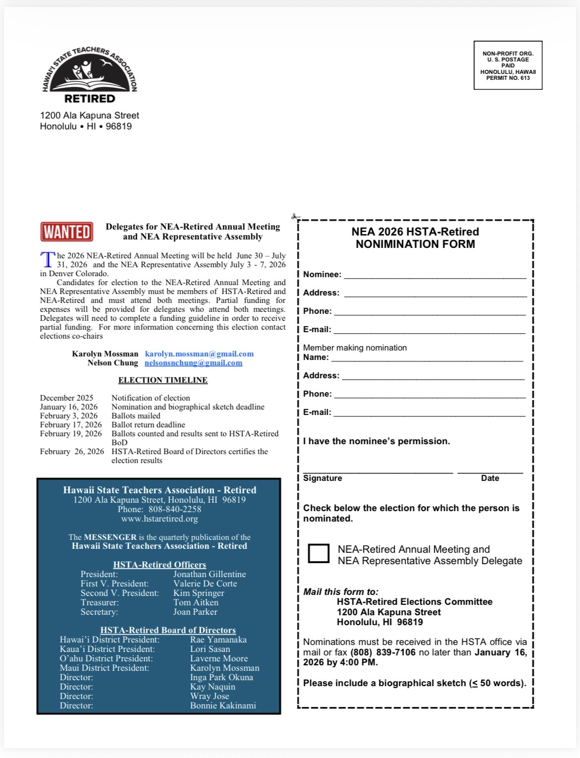 President’s Message HOT TOPICS! Worried about the takeover of our country by authoritarians? Click below to find an action group near you. Indivisible Hawaiʻi Find Events Vaccination Links Survey Results 2025 Delegate Assembly Documents Action for Change NOW! (Fast-Easy-Fun) SCAM! QUICK LINKS About Calendar Newsletter Membership & Dues Application Forms UPDATE YOUR ADDRESSES! In Memoriam Governance Officers & Leadership Budget Membership & Dues Legislative Goals Delegate Assembly Documents NEA Election Results Bylaws & Guidelines Scholarships, Awards, & Grants HEA/HSTA-Retired Professional Development Grant Apply by April 30, 2025! Awardees HSTA-Retired Distinguished Service Award Nominate Awardees NEA-Retired Distinguished Service Award Justin Wong 2019 NEA Partnership Funding NEA Foundation Awards Health EUTF Vaccination Links Claim Your Medicare Part B Reimbursement! NO MORE Medicare Part D Donut Hole! Health Check Tools I DON’T have a sleep disorder, do I? Retirement Planning to retire soon? Pre-Retirement Toolbox Useful Sites & Numbers State of Hawaiʻi Employees Retirement System Social Security AARP Hawaiʻi Returning to Work? HSTA ACTIVE HSTA.org Access HSTA Member Benefits Discounts HSTA VEBA VEBA PLANS NEA Active Welcome to NEA-Retired NEA Member Benefits Discounts Action Center NEA PAC Fallen Educators Memorial click any page to print Messenger Newsletter & Archive All About Us HSTA-Retired strives to protect and improve the general welfare of its members and to support public education Go to top of page Hawaii Mastodon