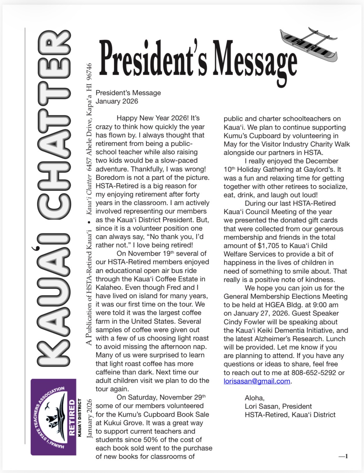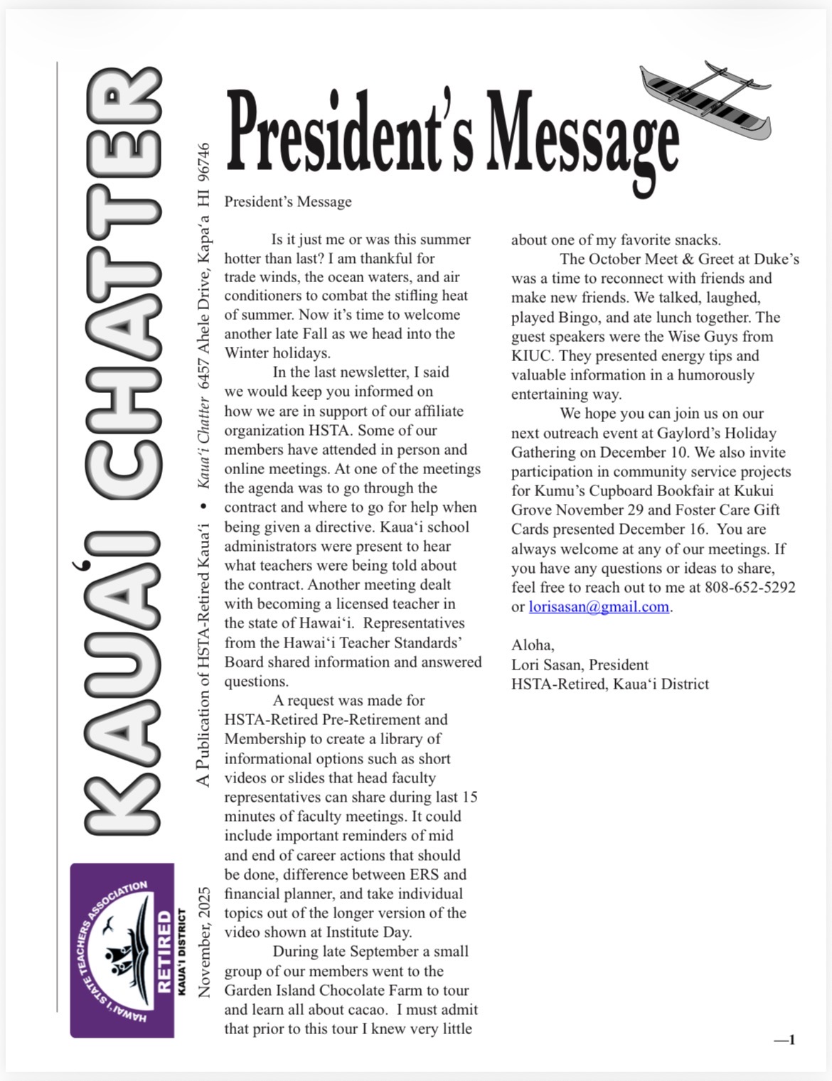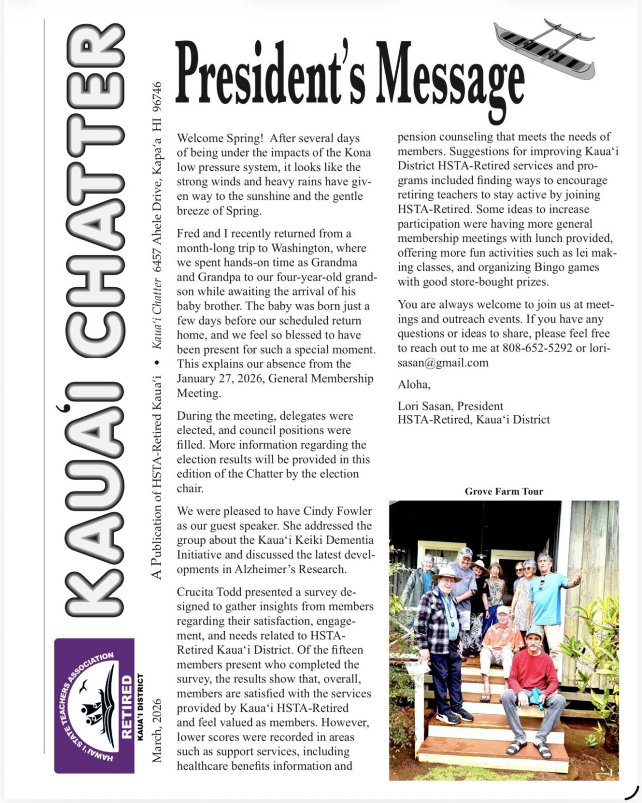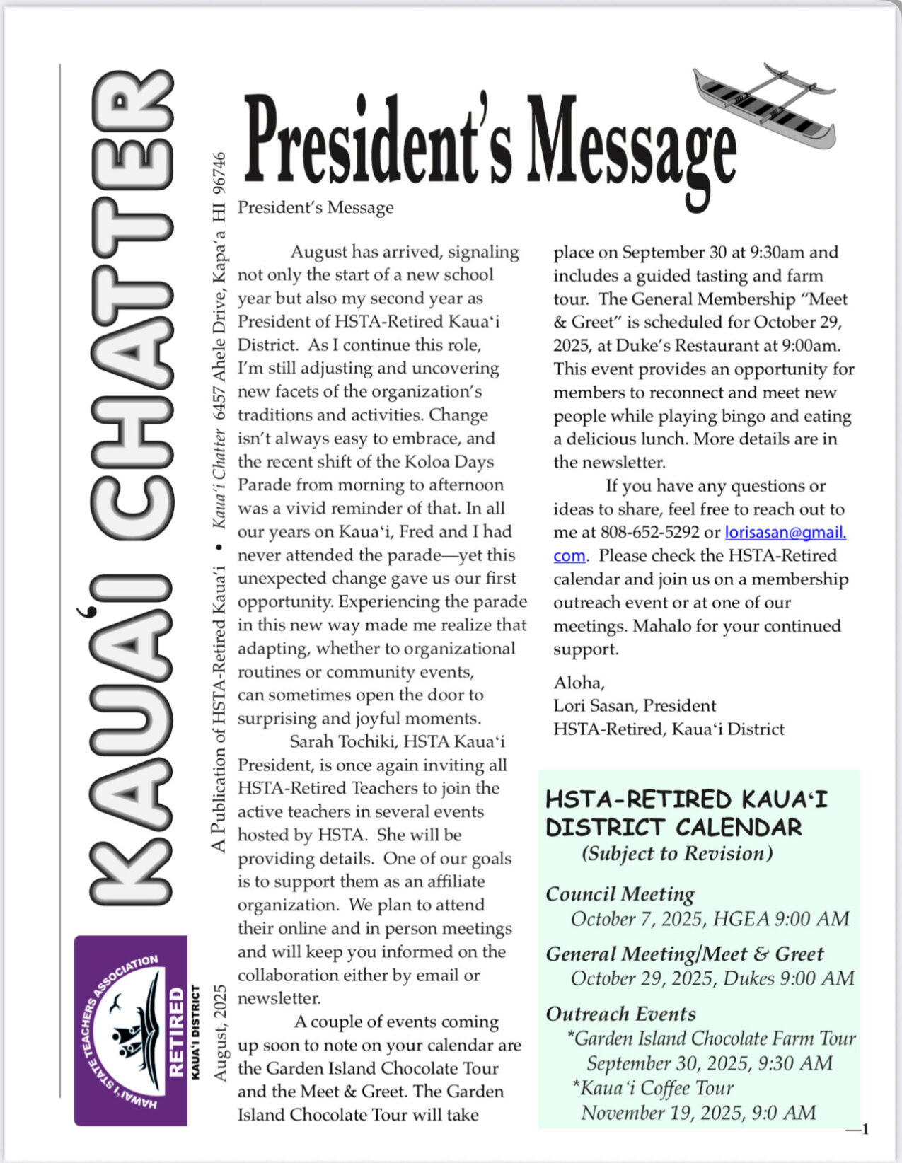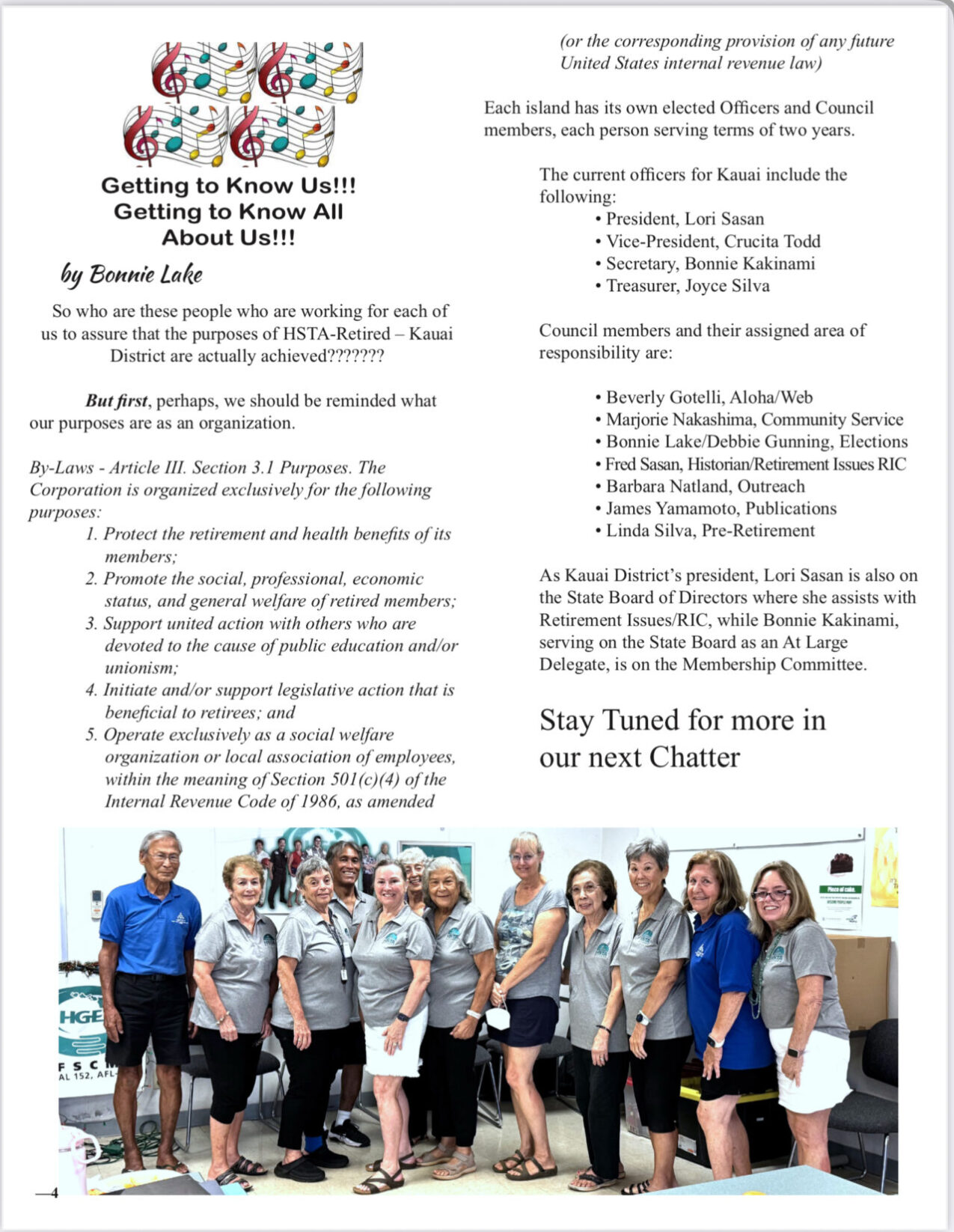 Chatter Archive Click any page to print HSTA-Retired strives to protect and improve the general welfare of its members and to support public education Kauaʻi District Page State Home Page