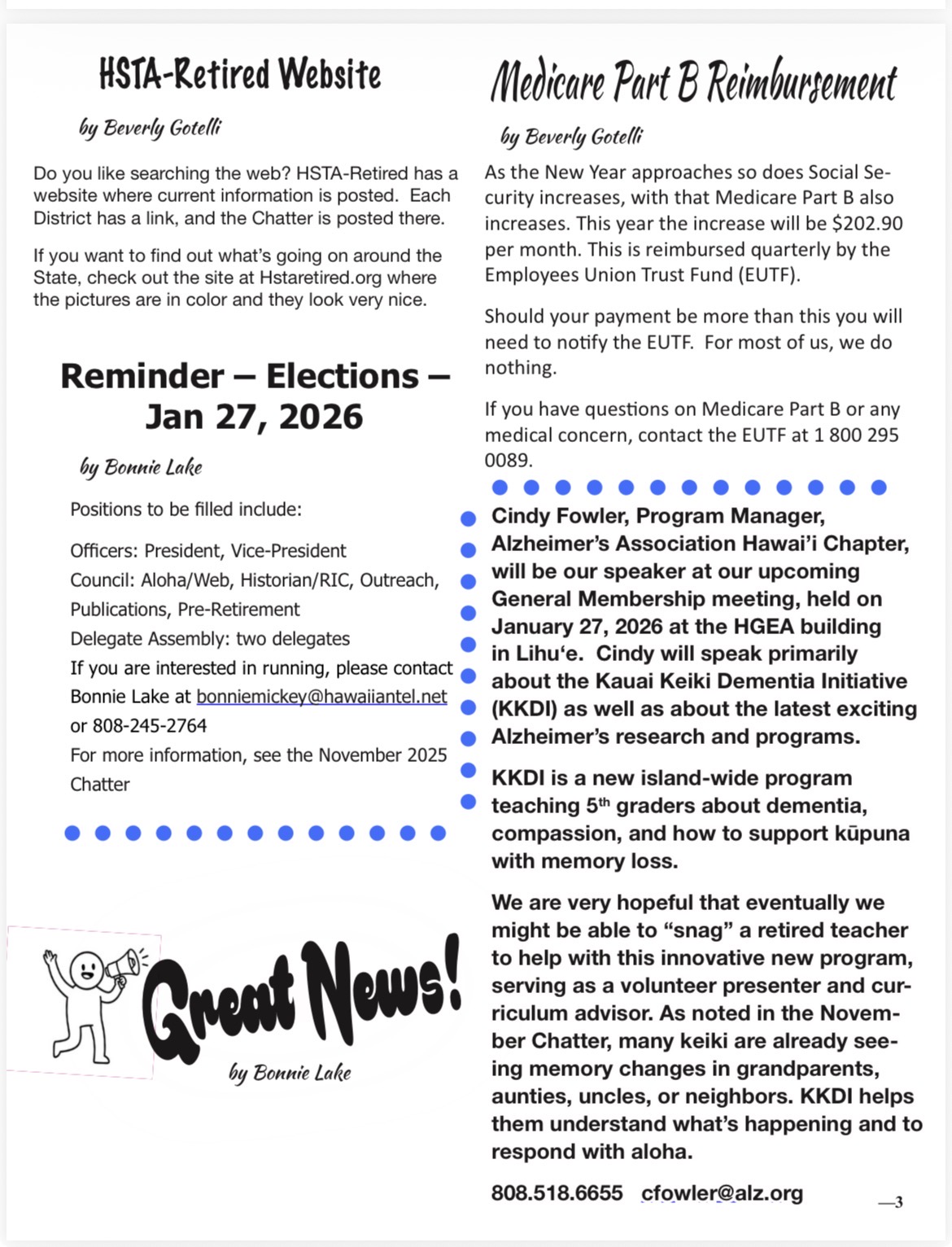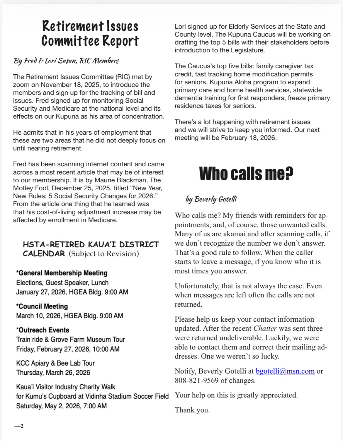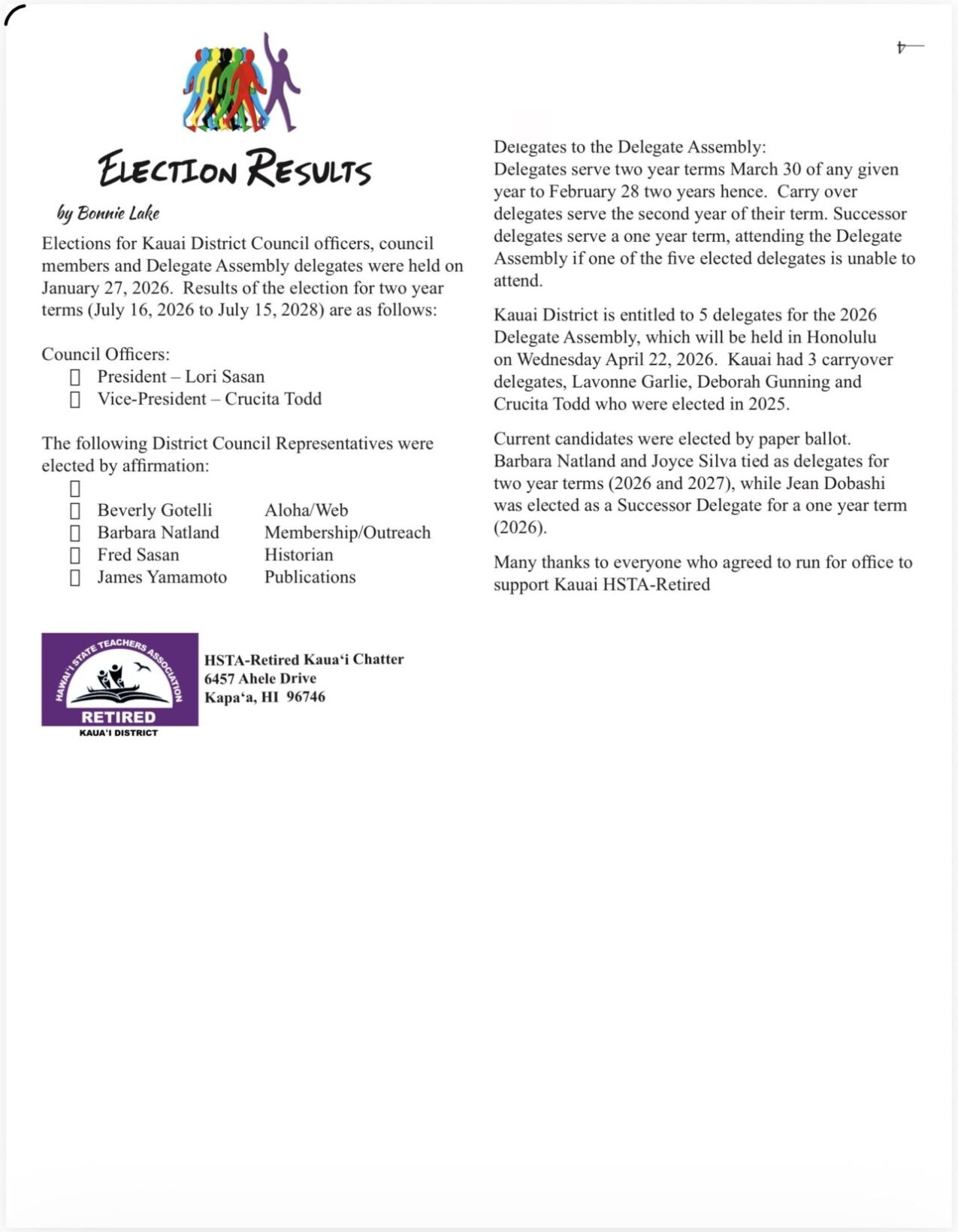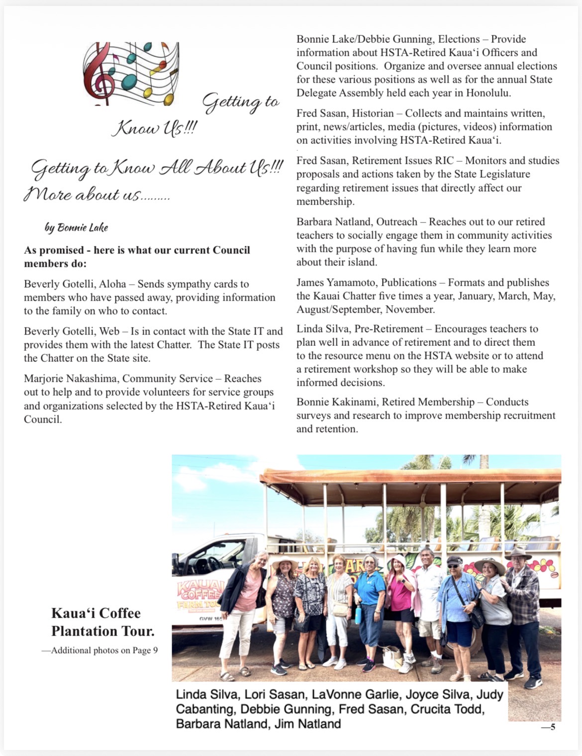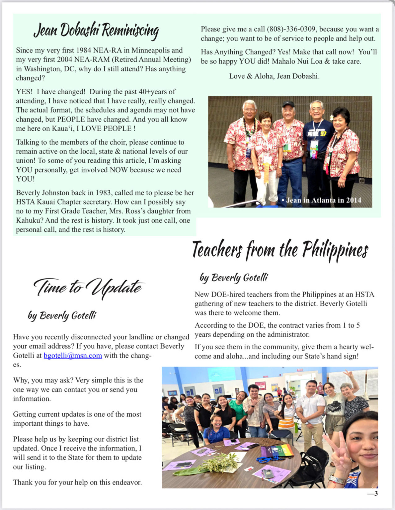 Chatter Archive Click any page to print HSTA-Retired strives to protect and improve the general welfare of its members and to support public education Kauaʻi District Page State Home Page