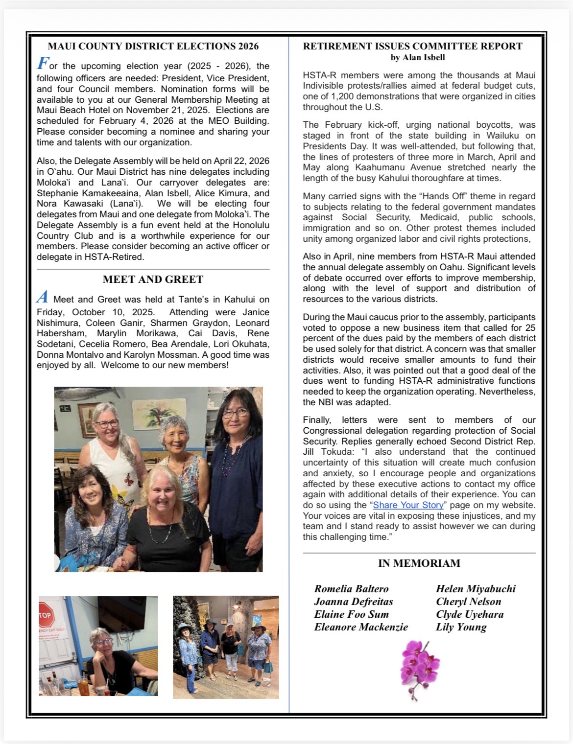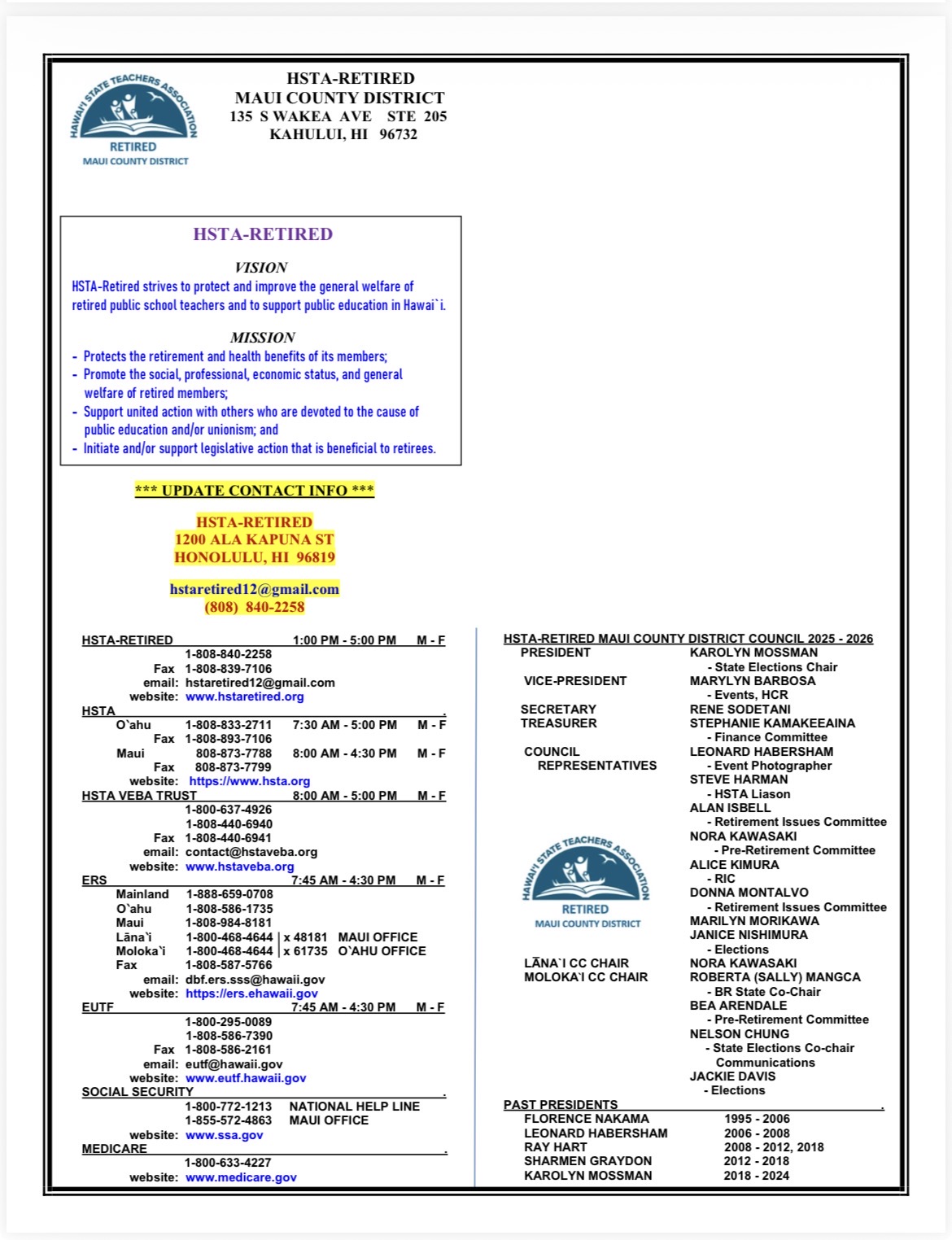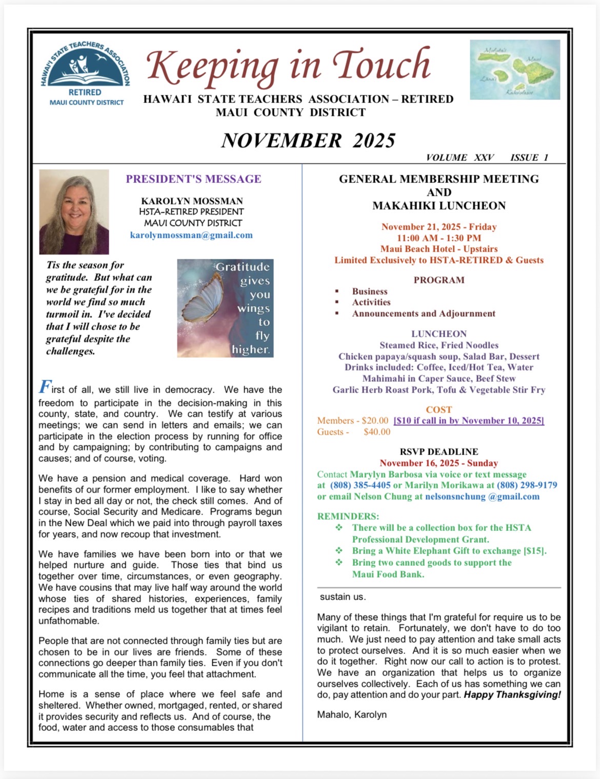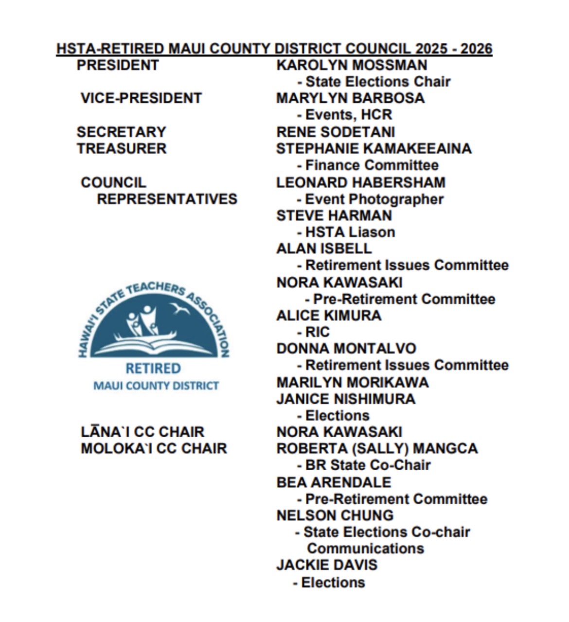 Maui County District Karolyn Mossman Chairperson District Guidlines click any page to print Keeping in Touch Newsletter Archive HSTA-Retired strives to protect and improve the general welfare of its members and to support public education. State Home Page