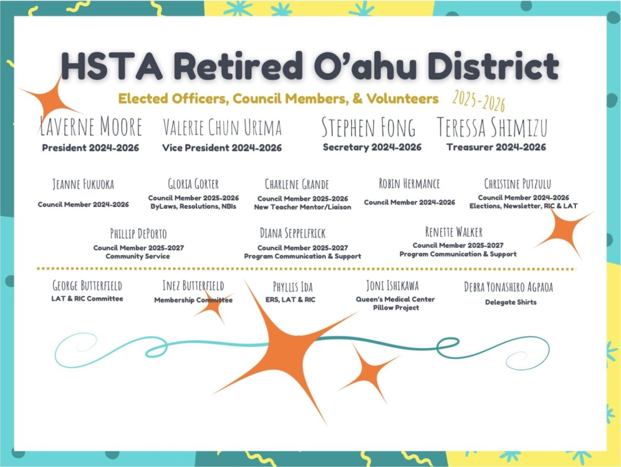 O‘ahu District Healthy ♥ Helpful ♥ Happy Laverne Moore Chairperson Officers & Leadership Calendar Distinguished Service Awardees from O‘ahu Sign up for Oʻahu District emails District Guidlines Guardian Newsletter HSTA-Retired strives to protect and improve the general welfare of its members and to support public education. State HomePage